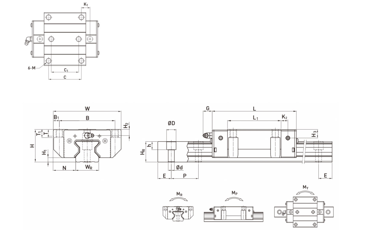 | H | H1 | N | W | B | B1 | C | C1 | L1 | L | K1 | K2 | G | M | T | T1 | H2 | T3 | WR | HR | D | h | d | P | E | mm | C (kN) | C0(kN) | kN-m | kN-m | kN-m | kg | Kg/m | |