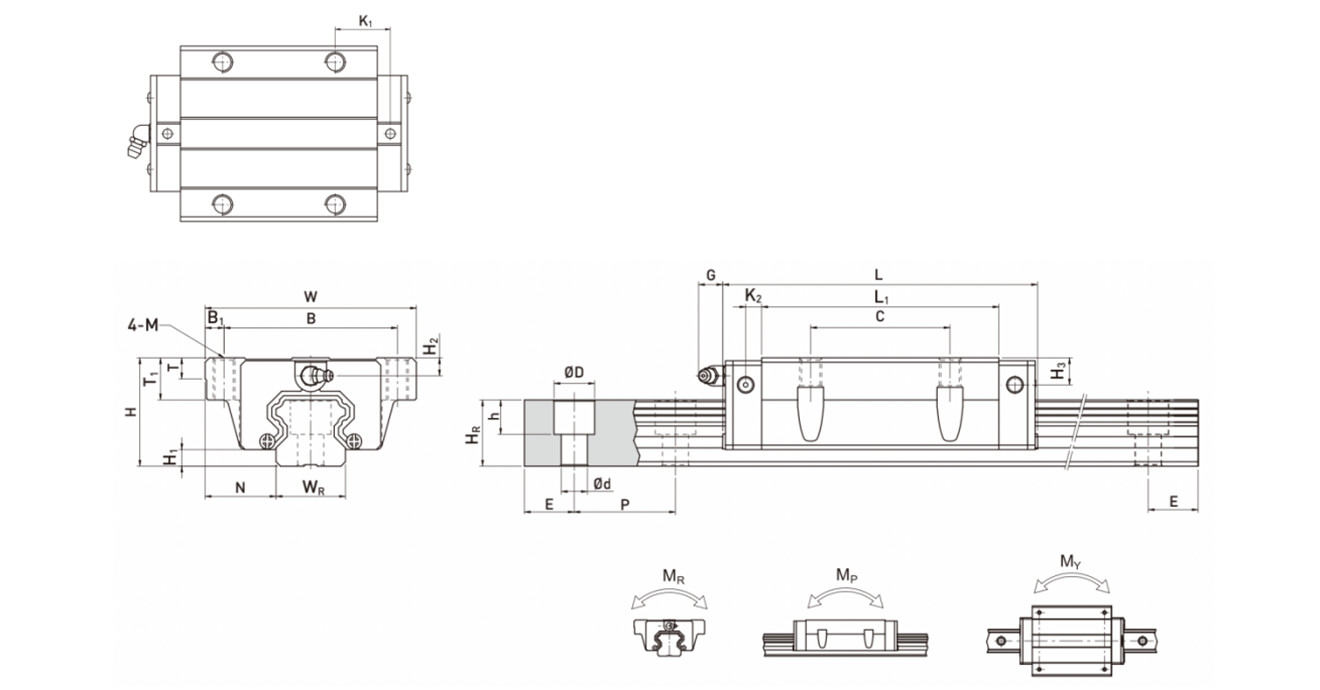 | H | H1 | N | W | B | B1 | C | L1 | L | G | M | T | T1 | H2 | H3 | WR | HR | D | h | d | P | E | mm | C (KN) | C0 (KN) | KN-M | KN-M | KN-M | kg | Kg/m | |