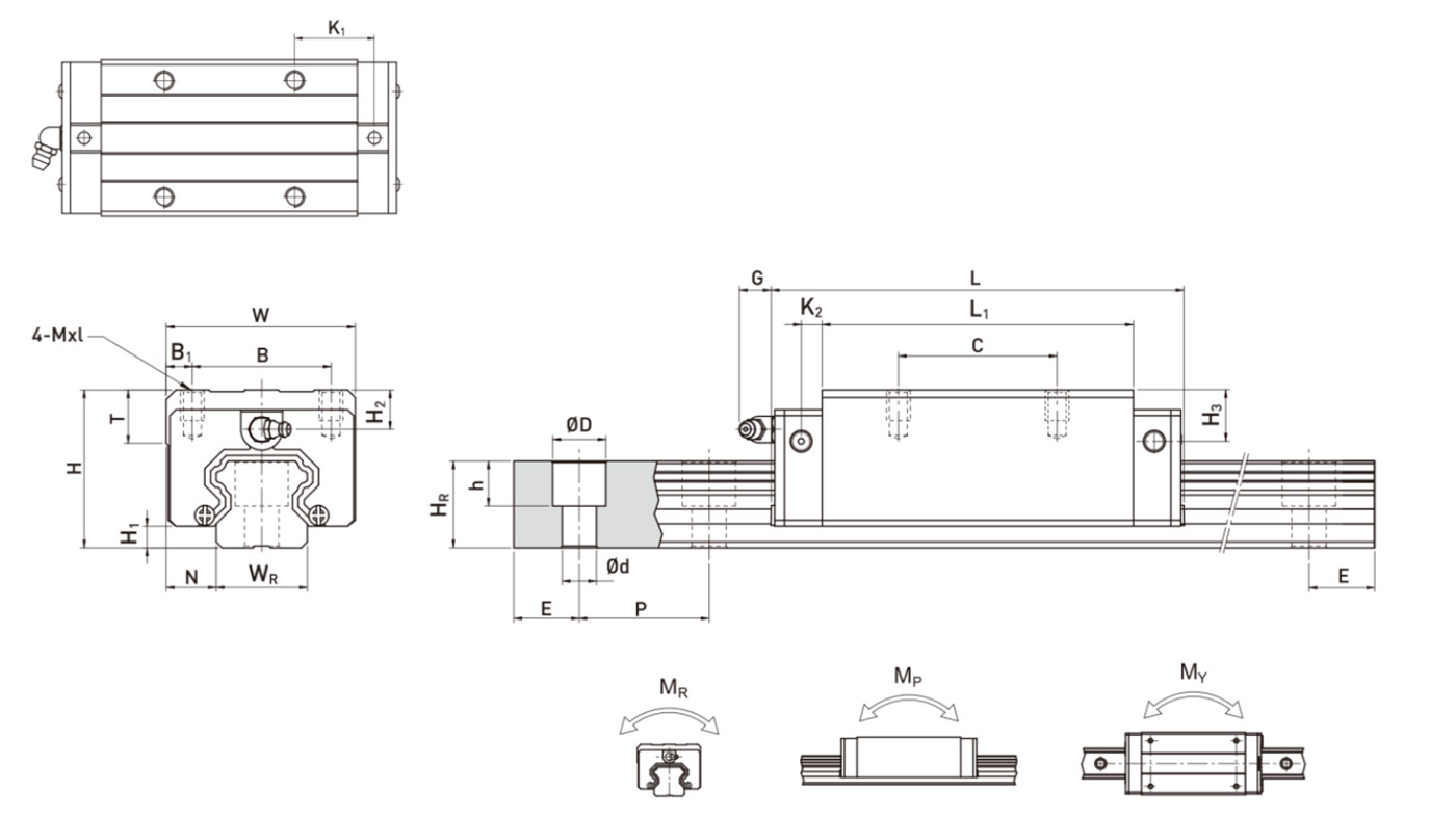 | H | H1 | N | W | B | B1 | C | L1 | L | G | Mxl | T | H2 | H3 | WR | HR | D | h | d | P | E | mm | C (kn) | C0(kN) | kn-m | kn-m | kn-m | kg | Kg / m | |
