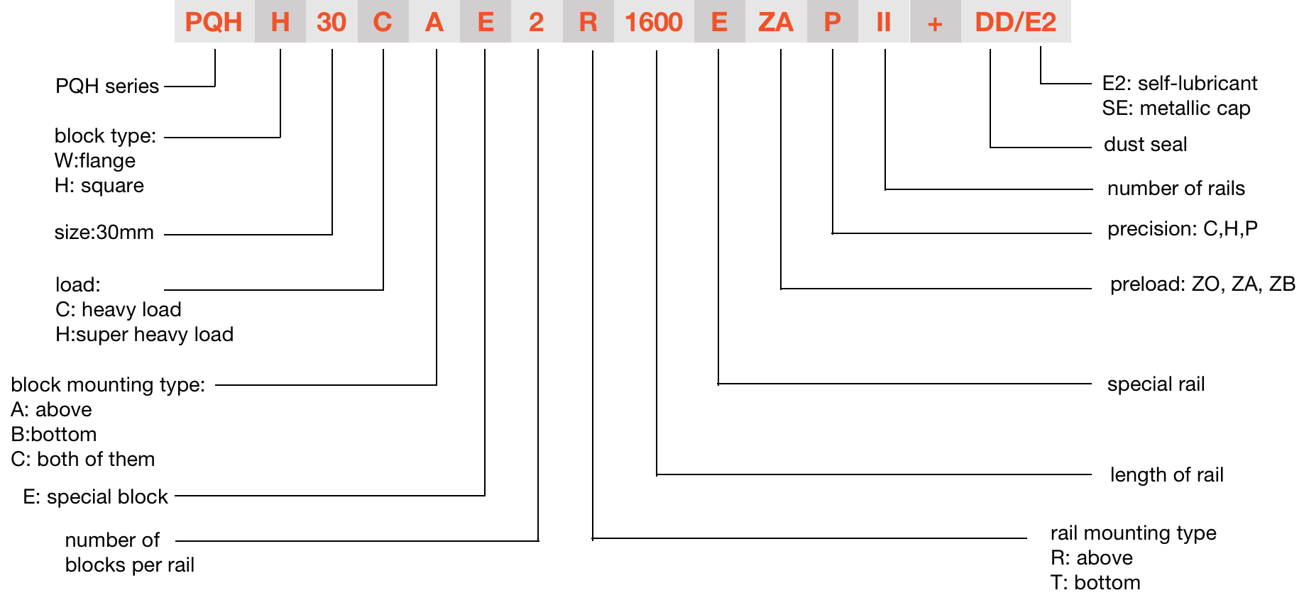 For PQH series linear slide assembly, we can know the definition of each code as follows: