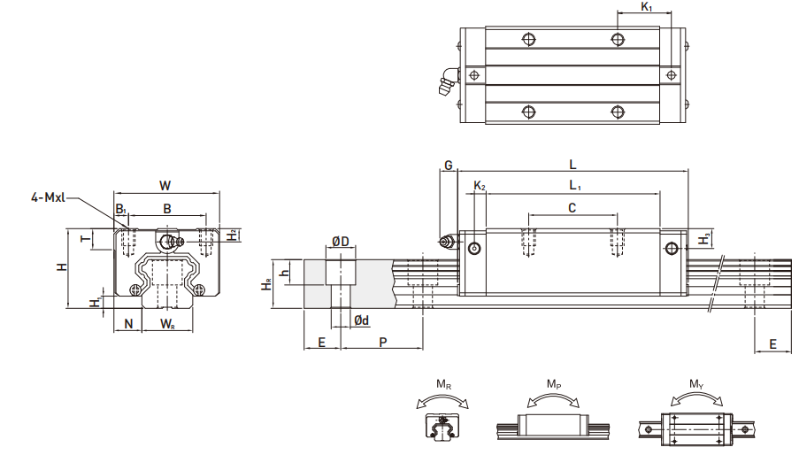 | H | H1 | N | W | B | B1 | C | L1 | L | G | Mxl | T | H2 | H3 | WR | HR | D | h | d | P | E | mm | C (kN) | C0(kN) | kN-m | kN-m | kN-m | kg | Kg/m | |